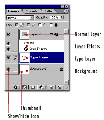 4).Fereastra Layer Normal layer: locul unde se afla layerul.       Layer Efects(Styles): Efecte speciale aplicate imaginii din layerul respectiv.In cazul de fata am folosit efectul drop shadow, dar se pot folosi mai multe efecte in acelasi layer.       Type Layer: la fel cu Image Layer, cu deosebirea ca acest layer contine text care poate fi editat.(Putem schimba forma, dimensiunea sau culoarea textului, etc.)       Background: Mereu blocat, nu poate fi pus deasupra altui layer si nu se pot aplica efecte asupra lui. Icoana alaturata acestuia arata ca este blocat. Poate fi transformat in layer normal prin dublu click pe thumbnail.       Thumbnail: Reprezentare miniaturiala a continutului layerului.       Icon-ul Show/Hide: Daca se vede icoana reprezentand ochiul inseamna ca layerul respectiv este vizibil. In caz contrar acesta este invizibil, pana la reapasarea pe icon-ul respectiv. |