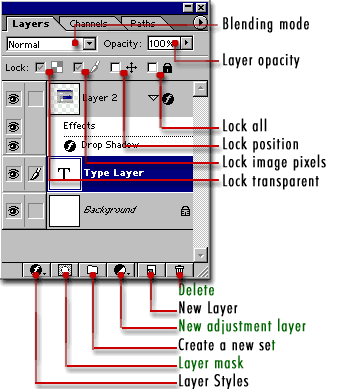 5).Caracteristicile Layerelor       Blending Mode: Schimba modul in care layerele interactioneaza intre ele. Puteti incerca diverse ipostaze pentru a intelege despre ce este vorba.       Layer Opacity: Ajusteaza nivelul de transparenta al fiecarui layer. 0 este complet transparent, 100 este complet opac.       Lock all: In cazul in care este selectata, aceasta optiune are efectul de a proteja layerul impotriva oricarui tip de editare.       Lock Position: Se pot face orice modificari cu exceptia mutarii imaginii.       Lock Transparent: Se poate desena in acest layer dar nu in zonele transparente.       Delete: Se sterge intregul layer. Se poate trage cu mouse`ul layerul respectiv peste icon-ul asociat cosului de gunoi de la baza ferestrei.       New Layer: Selectat pentru a crea un nou layer gol. Deasemenea putem trage un anumit layer peste icon-ul corespunzator acestei operatii pentru a-l duplica.       New Adjustment layer: Permite ajustari nedistructive de culoare asupra layerului(poate fi refacut totul, chiar dupa inchiderea documentului).       Create a new set: Permite organizarea layerelor in directoare.       Layer Mask: Permite indepartarea unor zone ale unui layer fara a distruge imaginea originala.       Layer Styles: Efecte speciale pentru layere. Putem realiza lucruri deosebite, cu efort minim. Sa incercam cateva macar! |