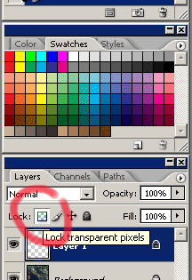7).Ce face checkbox-ul "Preserve Transparency"(Lock) ?       Bifand aceasta optiune, ne va permite sa lucram doar asupra acelor portiuni din layer care sunt "pigmentate" - adica au informatie reprezentata prin pixeli. Zonele neacoperite de pixeli vor parea transparente si nu vor fi afectate. Unele filtre, ca Blur, nu pot functiona daca aceasta optiune este selectata, pentru ca trebuie sa poata distribui culoare in zonele transparente. |